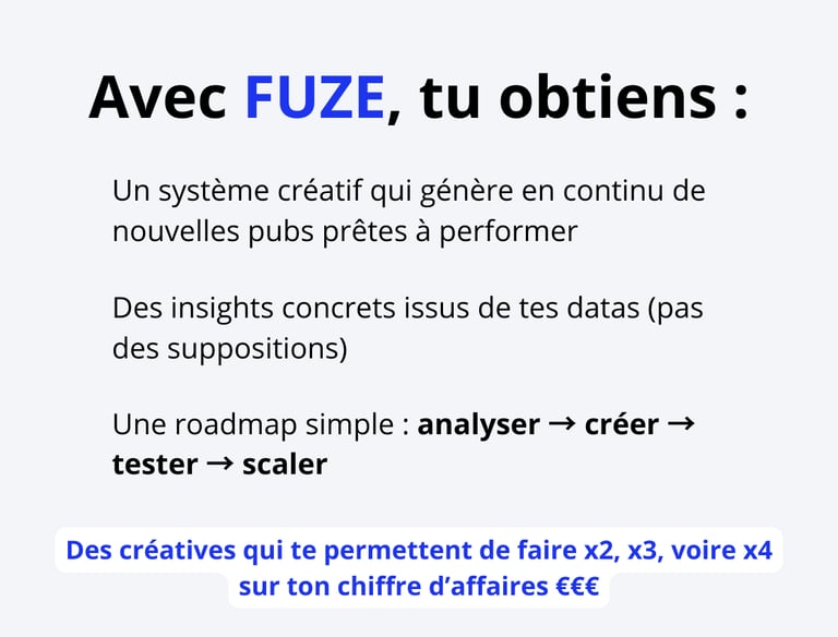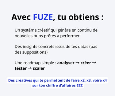 👉 Résultat : un stock de créas prêtes à scaler, livrées en 90 jours max